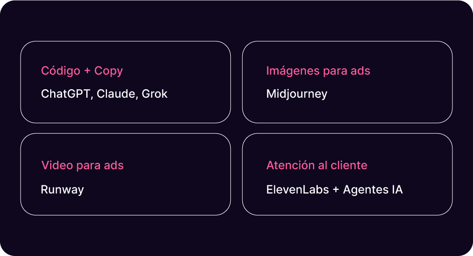 Esto es lo que realmente nos interesa. Gallagher usó más de una docena de herramientas de IA para reemplazar lo que normalmente necesitaría decenas de empleados. El sitio, los anuncios, la atención al cliente, el análisis de métricas, todo pasa por IA.