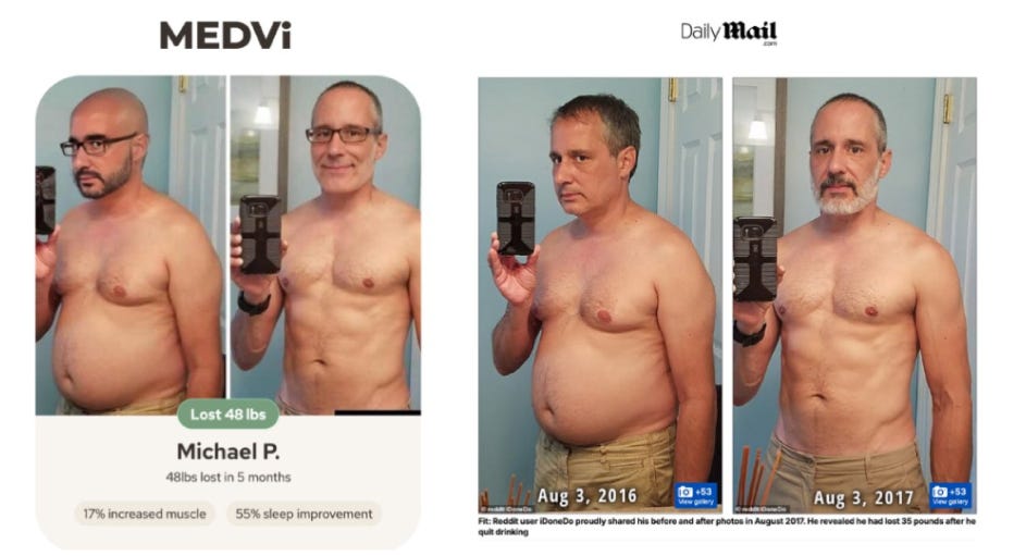 También usó imágenes deepfake de “antes y después” generadas por IA al inicio. Luego las reemplazó por reales, aunque quedaron rastros.