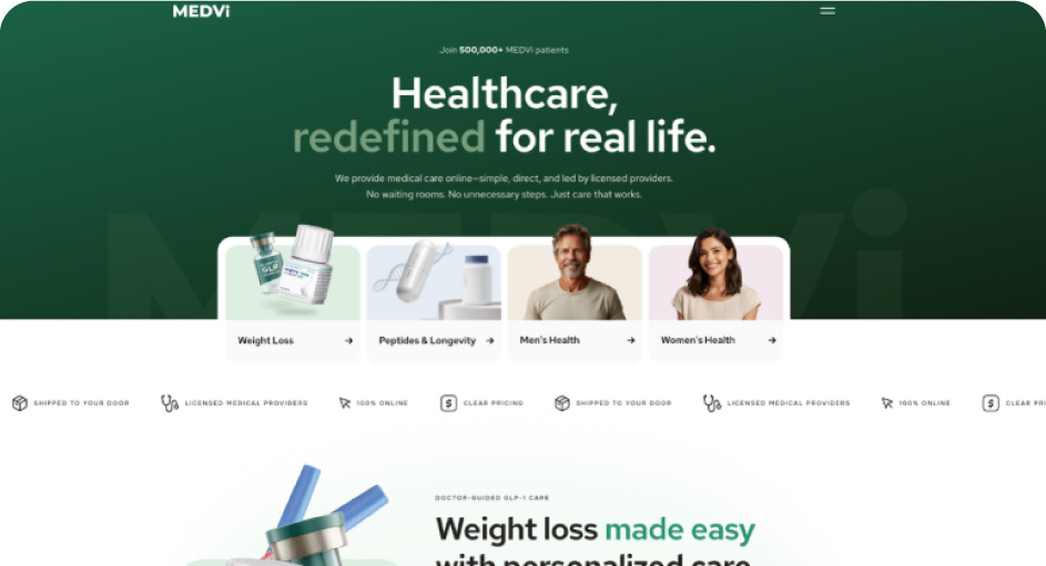 Medvi vende medicamentos GLP-1 compuestos para pérdida de peso (las versiones genéricas de Ozempic y Wegovy, más baratas). El cliente llena un cuestionario online, paga alrededor de $200 al mes y recibe el medicamento por correo. Sin visita al médico, o sea, sin fricciones.