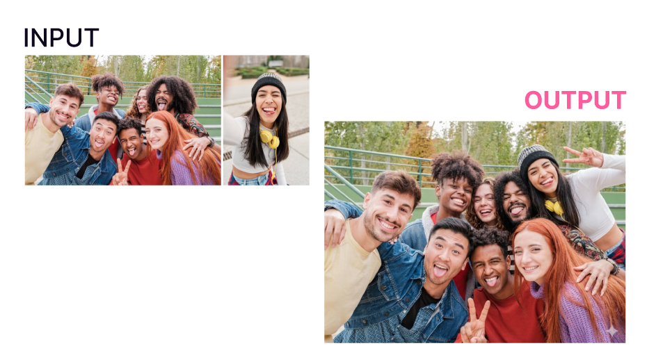 Use the uploaded group selfie as the base image and seamlessly add the person from the second photo as if they were originally in the picture (you can change her pose if neccesary). only integrate the missing friend realistically, keep the aspect ratio.Esto es solo el comienzo