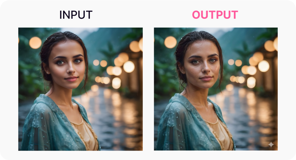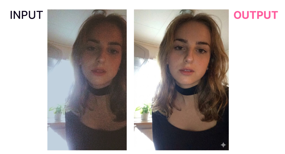 Enhance quality of the uploaded selfie while keeping the person’s features completely natural. Avoid plastic or airbrushed look. Keep the original colors, background and composition.También puede recuperar fotos de baja calidad como selfies pixeladas, imágenes en mala iluminación, ruido digital, sombras duras o fotos tomadas con cámaras antiguas.