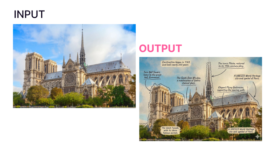 Turn the uploaded photo of notre dame cathedral into a travel infographic with interesting information. Add labels for the main landmarks visible in the image, with handwritten callout lines and text.Prompt (producto):