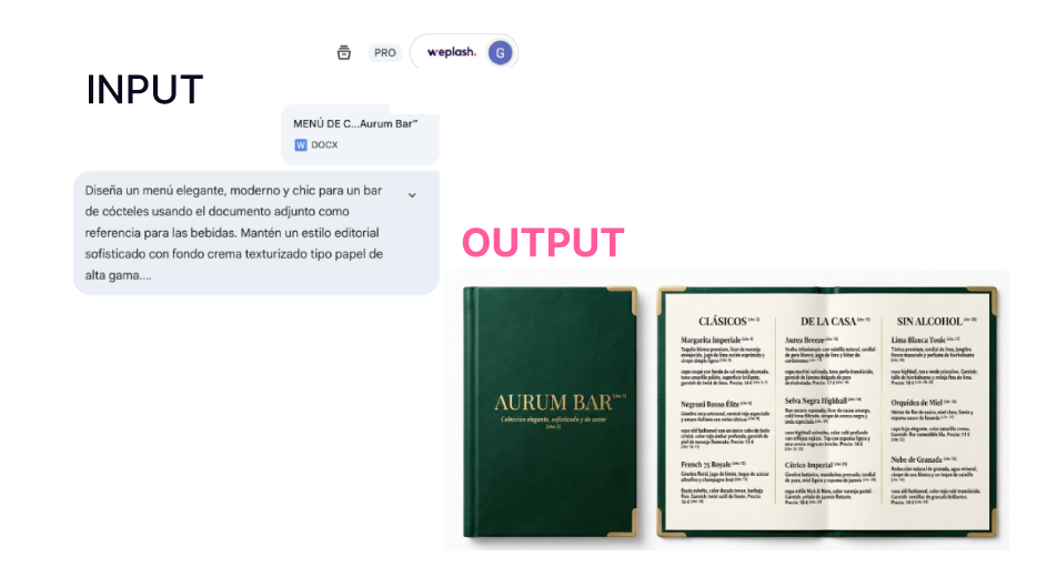 Escribe tu texto exacto en el prompt o adjunta un documento (copy, menú).