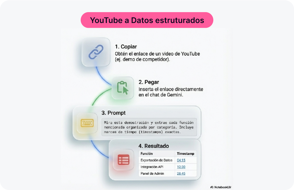 Paso 2: Pégalo en Gemini y escribe: “Mira esta demostración y extrae cada función mencionada organizada por categoría... incluye marcas de tiempo (timestamps)”.