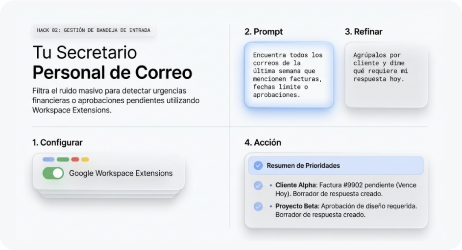 Paso 2: Prompt: “Encuentra todos los correos que mencionen facturas o deadlines de la última semana. Agrúpalos por cliente y dime qué requiere respuesta hoy”.