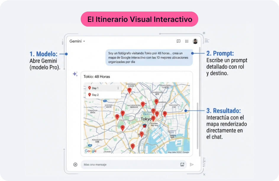 Paso 2: Escribe un prompt detallado con tu rol y destino. Ej: “Soy un fotógrafo visitando Tokio por 48 horas... crea un mapa de Google interactivo con las 10 mejores ubicaciones organizadas por día”,.