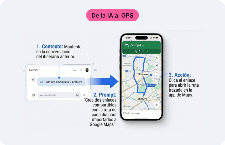Paso 2: Prompt: “Crea dos enlaces compartibles (shareable links) con la ruta de cada día para importarlos a Google Maps”.