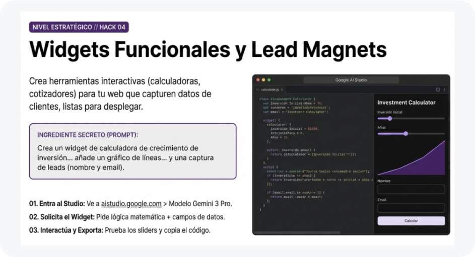 Paso 2: Pide una herramienta específica. Ej: “Crea un widget de calculadora de inversión... añade un gráfico reactivo... y pide nombre/email al final”.