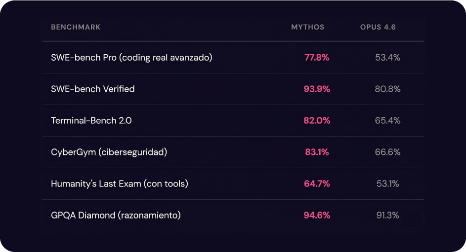 Durante todo 2025, los mejores modelos del mundo (Claude, GPT-5.4, Gemini) estaban estancados entre 80% y 85%. Mythos llegó a 93.9%. Y en SWE-bench Pro, la versión más difícil, el salto es de 24 puntos porcentuales.