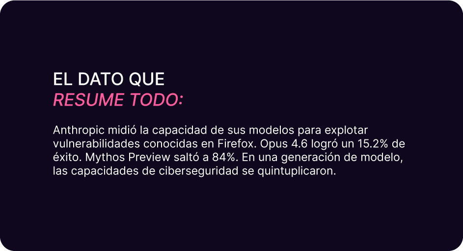 Los benchmarks de coding son impresionantes. Pero lo que realmente le quitó el sueño al equipo de Anthropic fue un efecto colateral. Mythos no fue entrenado específicamente para hackear, sino para ser extremadamente bueno programando. Y resulta que cuando un modelo entiende código a ese nivel, también entiende dónde están las fallas.