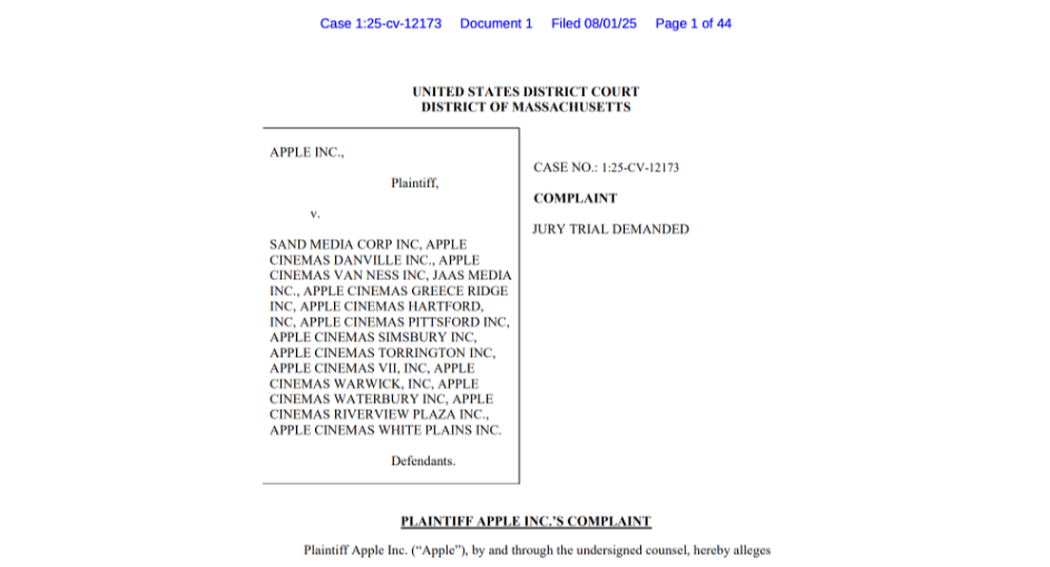 Según la demanda, están “capitalizando el prestigio y reconocimiento de la marca “Apple” al abrir cines cerca de la sede central de Apple en Cupertino y lanzar una expansión nacional.