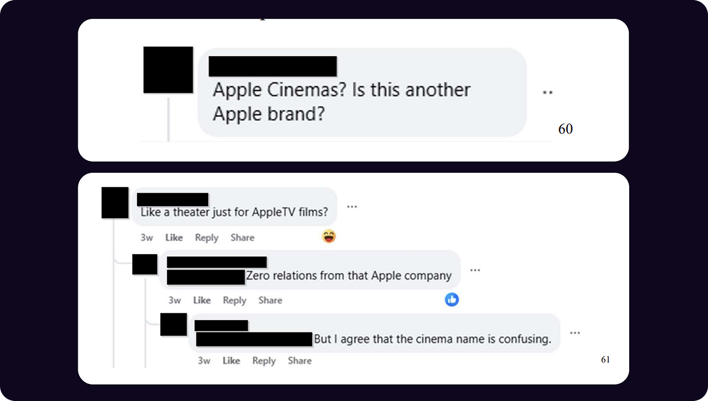 Aunque no venden lo mismo (uno vende entradas de cine y otros productos tecnológicos), Apple alega que el simple uso del nombre genera confusión. Incluso presentaron capturas de redes donde usuarios preguntaban si los cines tenían algo que ver con Apple Inc.