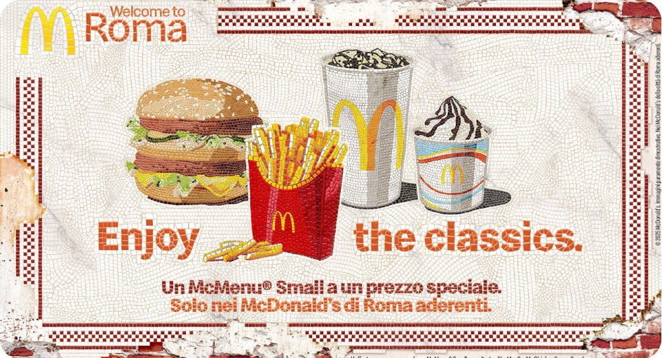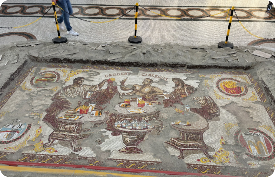 Instaló un falso mosaico romano con figuras en toga comiendo Big Macs.