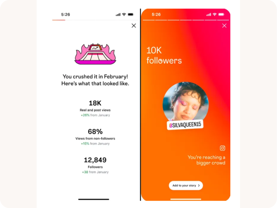 Nuevas funciones para creadores: resúmenes semanales/mensuales con stats clave (vistas, seguidores, etc.) y tarjetas animadas para celebrar hitos como llegar a 10K seguidores o un Reel viral.