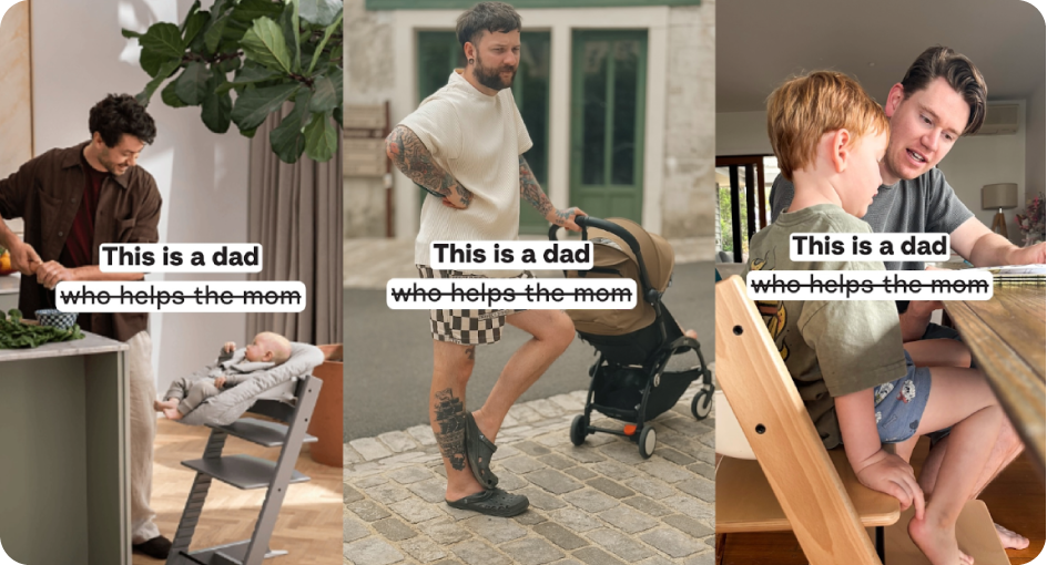 Muestra a padres cocinando, leyendo y cuidando como protagonistas, no ayudantes. Y de paso, enseña sus sillas y carritos con estilo.