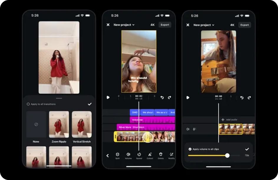 Ahora incluye más transiciones (como Zoom Ripple y Vertical Stretch), control más preciso de los cortes y una opción para ajustar el volumen en todos los clips a la vez.