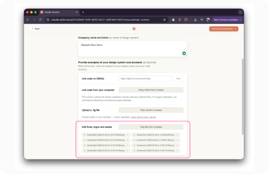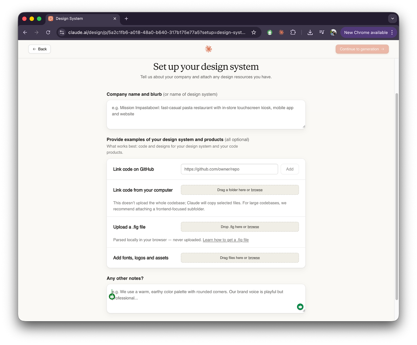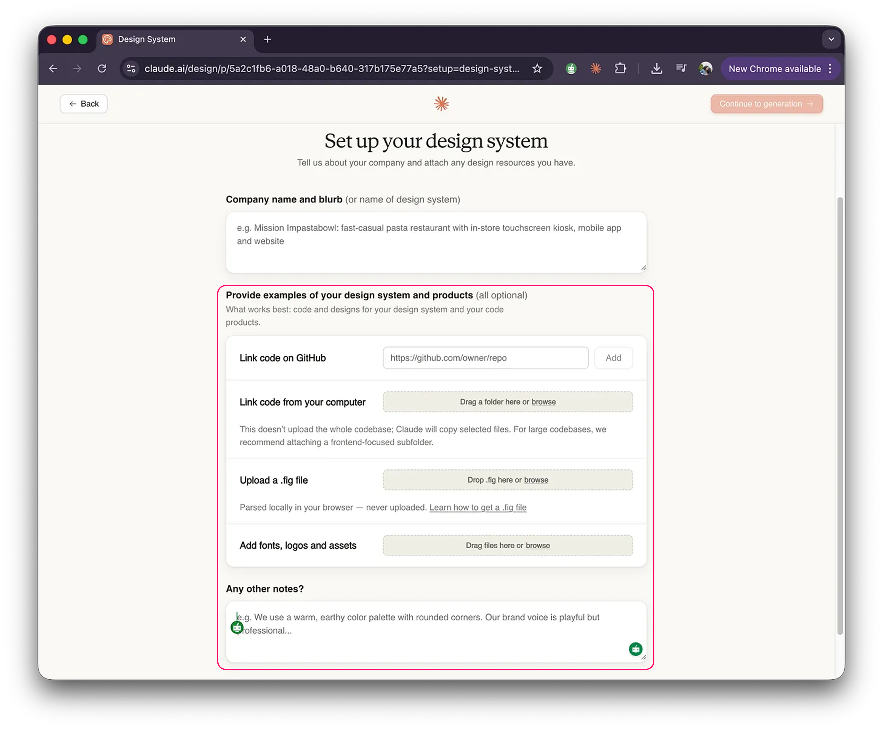 ✍️ Nota: como ves en el setup de Design system te deja subir muchas cosas más. Un repo de GitHub o una carpeta local con código, un archivo .fig de Figma que se procesa directo en tu navegador sin subirse a ningún servidor, y un campo libre para notas de marca (tono, sensación, principios). Todas esas opciones son para equipos con producto digital, design system propio o diseñadores in-house que ya tienen todo estructurado.