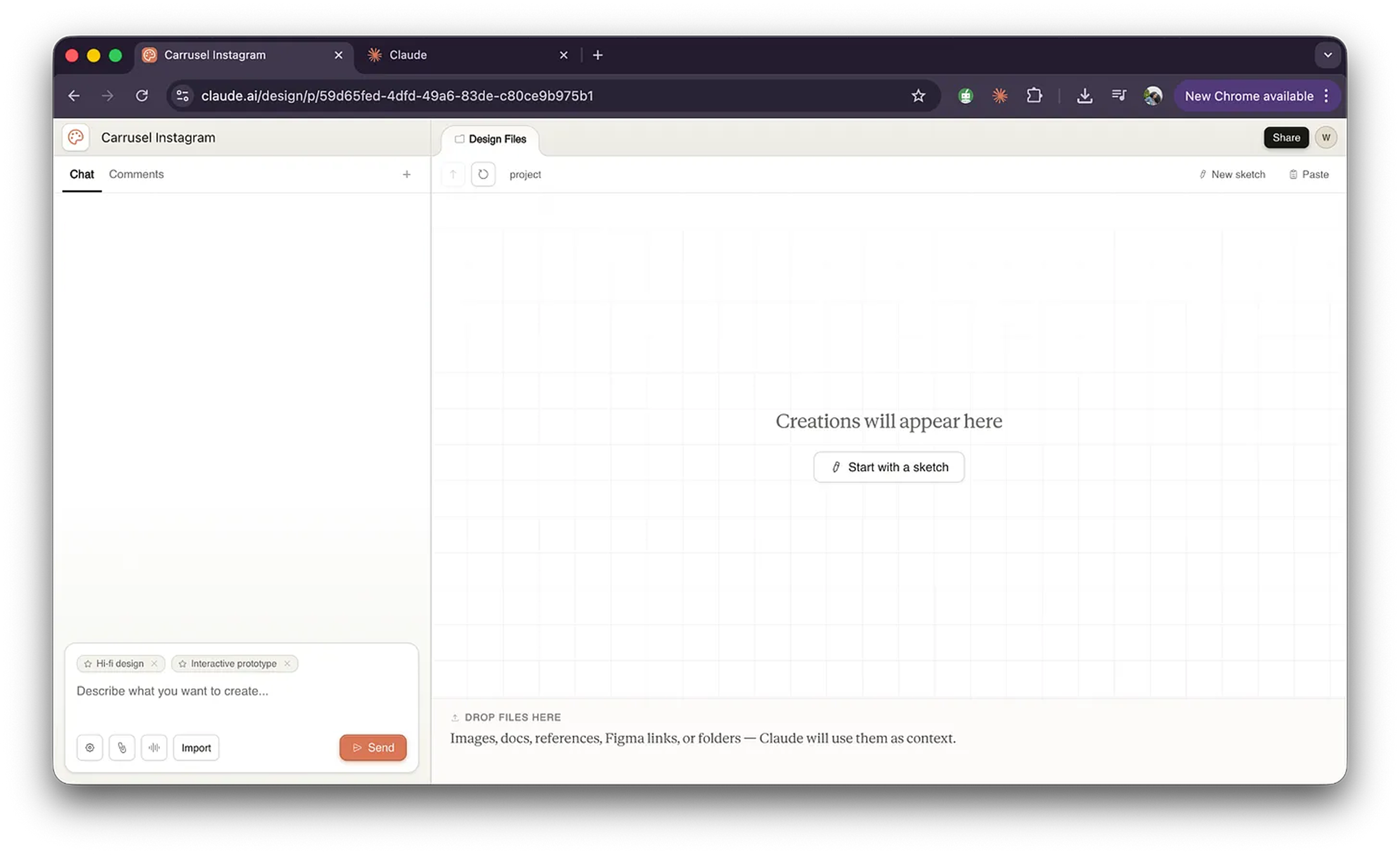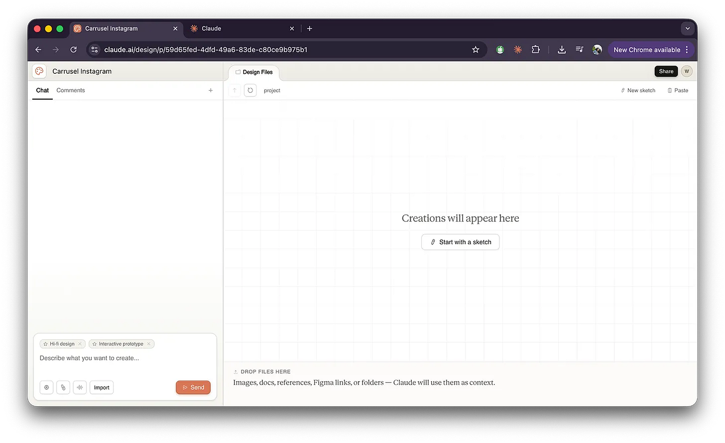 El flujo es simple. Le pones nombre al proyecto, confirmas High fidelity, haces clic en Create, y ahí se abre el entorno real de trabajo: chat a la izquierda, canvas a la derecha. Escribes lo que quieres y Claude empieza a generar.