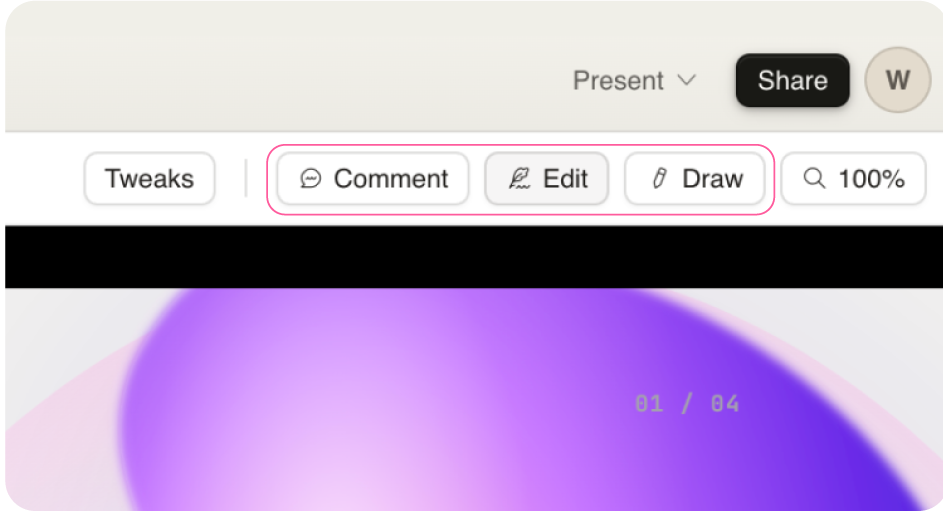 Comment sirve para dejar una nota sobre algo puntual sin tocar nada, ideal cuando quieres marcar “este color no me cuadra” y que Claude lo resuelva. Edit es para meterle mano directo: cambias el texto, mueves elementos, reemplazas lo que sea tú misma. Y con Draw dibujas flechas, encierras zonas, garabateas sobre el diseño y Claude entiende lo que le pides visualmente.