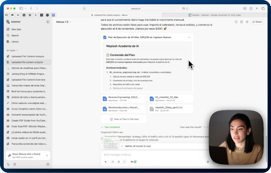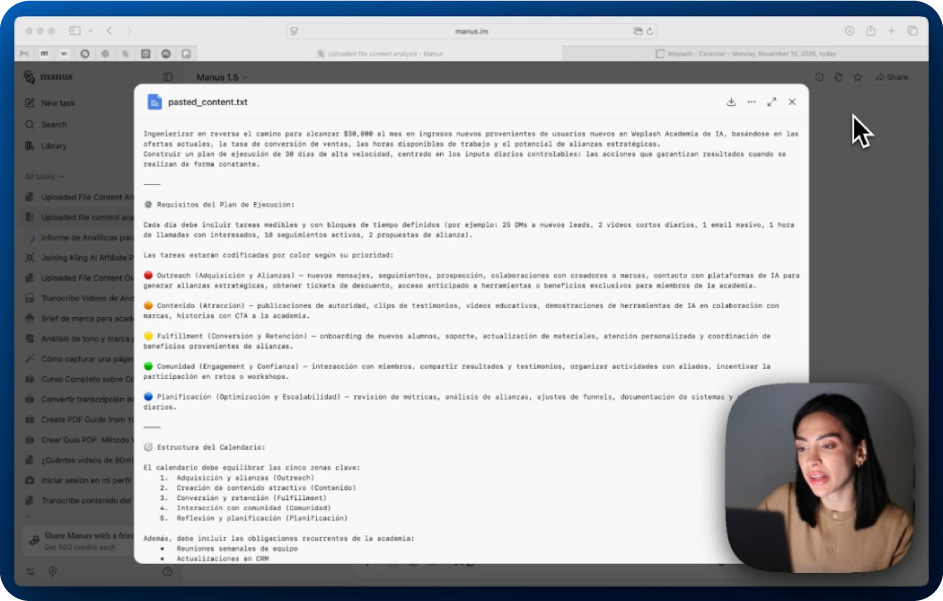 Las metas no requieren “cierre de año” para arrancar. Si esperas a enero, llegas detrás. Con Manus 1.5 puedes ordenar tu objetivo en pasos concretos y verlo en tu calendario con fechas y bloques reales. La idea es simple: ingeniería inversa de tu meta (por ejemplo, “$30K/mes” o “$50K/mes”) traducida a acciones controlables, con una cadencia que puedas sostener. Aquí va, en corto: cómo se hace y qué te entrega.