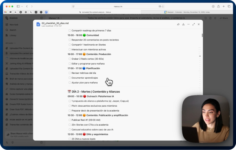 Tip pro: al cerrar la semana puedes reportar resultados (lo que funcionó y lo que no) y Manus re‑ajusta la semana siguiente. Es un plan vivo: decide, mide y corrige sin perder la cadencia.