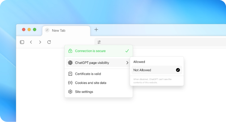 En privacidad, decides tú. Incógnito cuando quieras, elegir qué páginas puede “ver” y si tu navegación se usa para entrenar (por defecto, no).