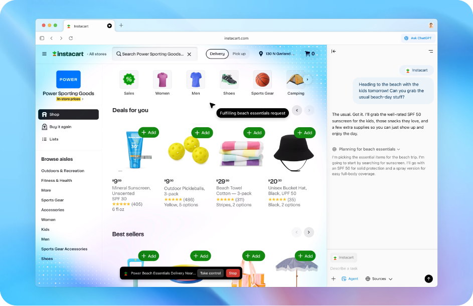 Atlas vive dentro del flujo con sidebar para resumir o explicar lo que lees, asistencia en cualquier campo de texto para escribir mejor sin cambiar de pestaña, y un modo agente que puede abrir páginas y completar tareas bajo tu supervisión.