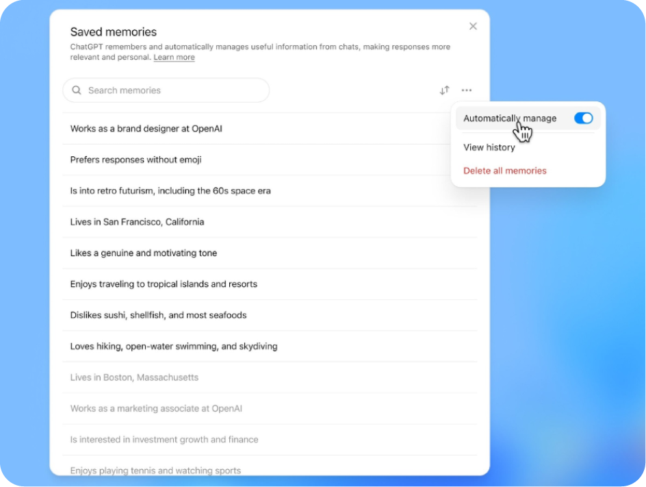 ChatGPT ahora gestiona tus datos de forma automática, guarda lo útil, olvida lo irrelevante y te permite revisar o borrar todo con un clic. Además, puedes buscar dentro de tu propio historial como si fuera tu segundo cerebro digital.