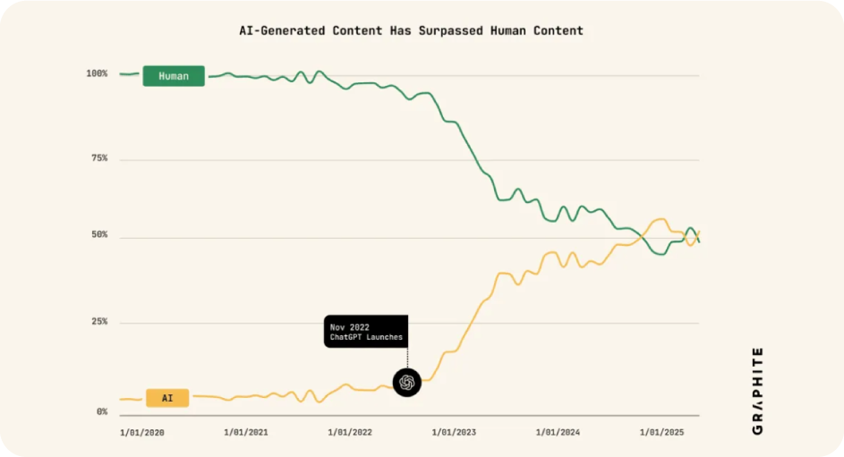 Un estudio de Graphite reveló que la cantidad de artículos escritos por AI igualó a la de humanos a mediados de 2025.