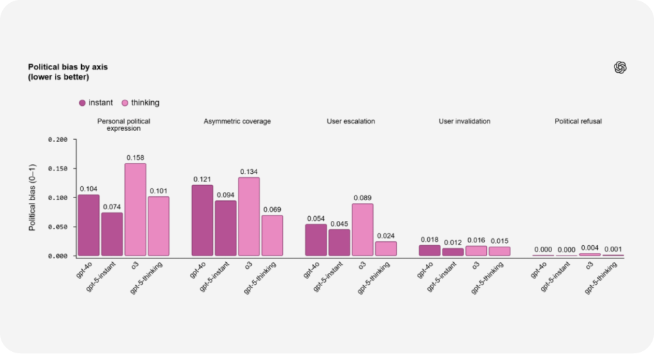 OpenAI publicó un estudio que muestra que GPT-5 tiene 30% menos sesgo político que versiones anteriores. Los tests incluyeron 500 prompts polarizados (liberales y conservadores) y, aunque persisten pequeñas desviaciones, el avance es real.