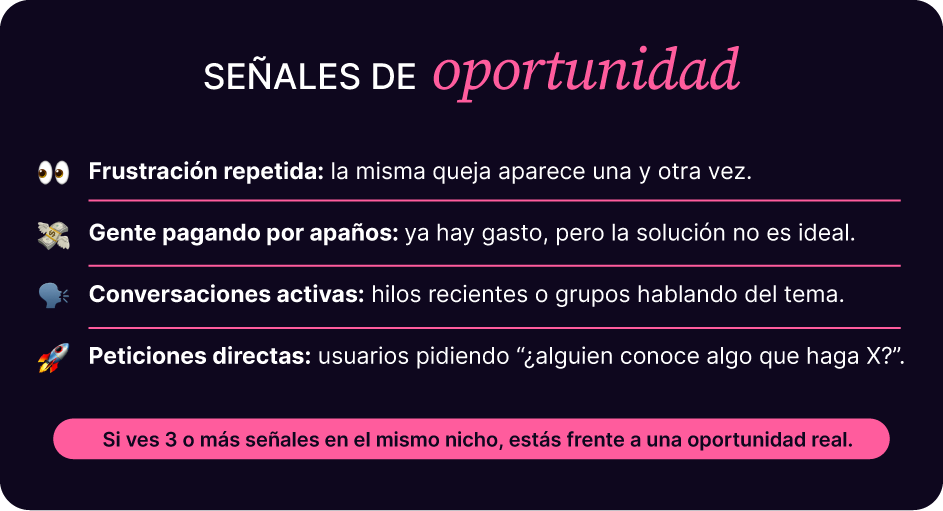 Ya no se trata de esperar a que alguien más te diga dónde está la oportunidad, sino de aprender a leer el mercado. Plataformas como Reddit, Perplexity o GummySearch son auténticas minas de oro, allí están las frustraciones reales de la gente, expresadas sin filtro.