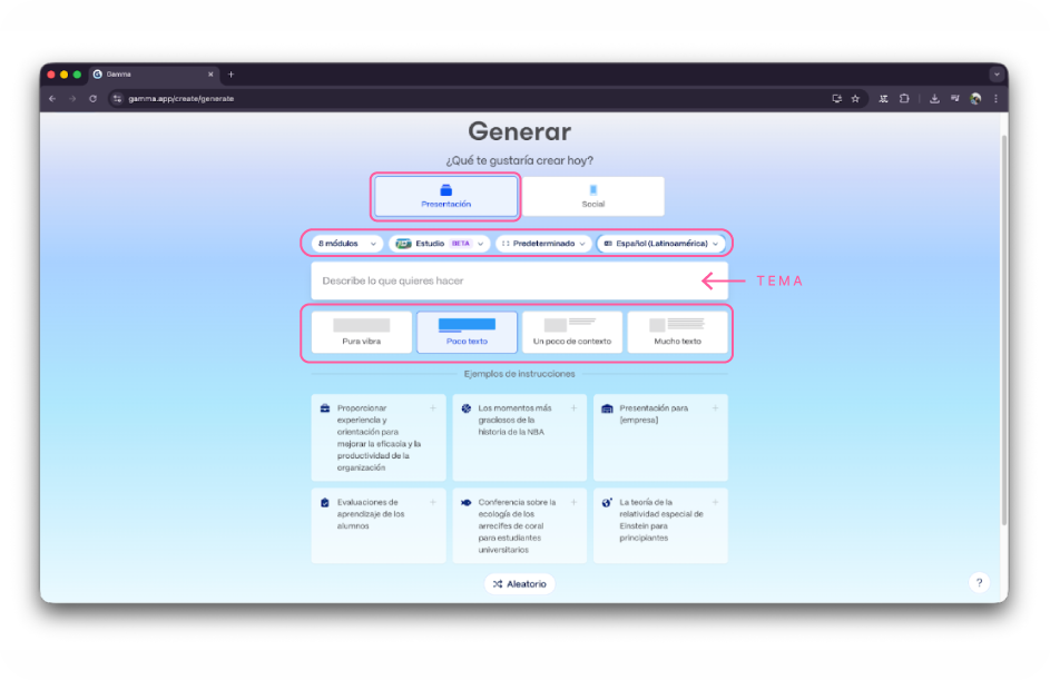 En esta primera pantalla defines lo esencial: el tema que quieres desarrollar, cuántas tarjetas tendrá la presentación y en qué idioma. Abajo Gamma te sugiere ideas de prompts al azar, pero también puedes escribir el tuyo desde cero. Luego eliges cuánto texto quieres que tenga cada slide y generas el esquema.