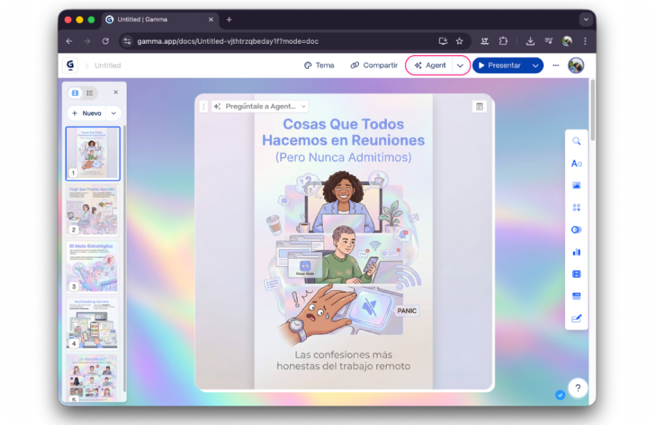 💡 Un par de tips importantes antes de usarlo en producción. Esta funcionalidad todavía está en beta, así que no es perfecta ni infalible, pero sí es una ayuda enorme para acelerar la creación de carruseles y presentaciones sin empezar desde cero. Si necesitas ajustar algo (un texto, una imagen o el tono de una slide) puedes usar el botón Agent para editarlo con ayuda de la IA directamente dentro de Gamma.