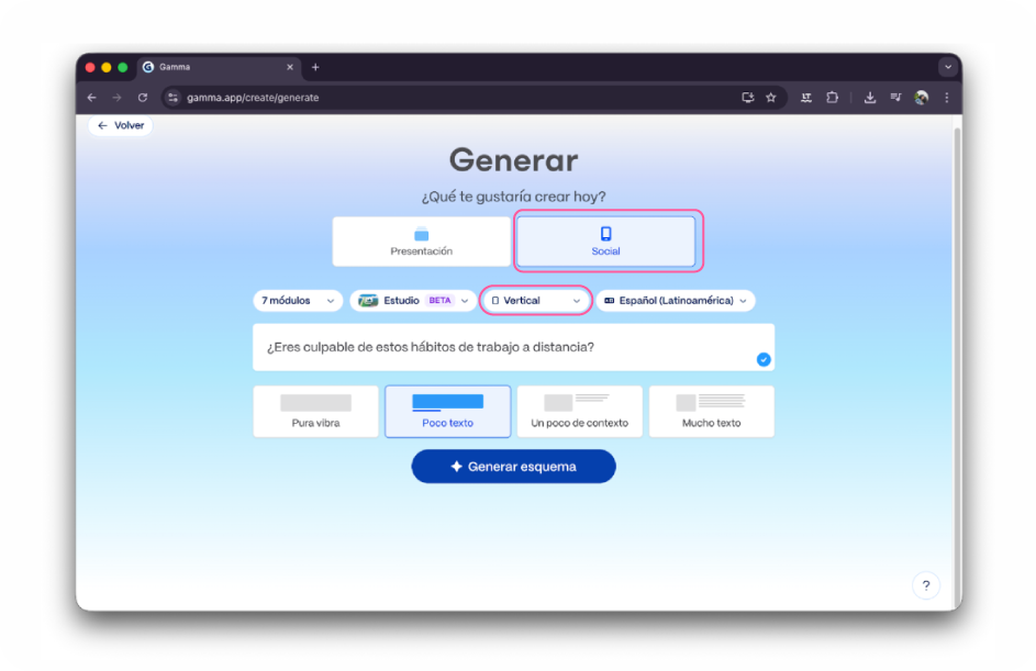 Además de presentaciones, Gamma permite usar el mismo flujo para crear carruseles para redes sociales.
