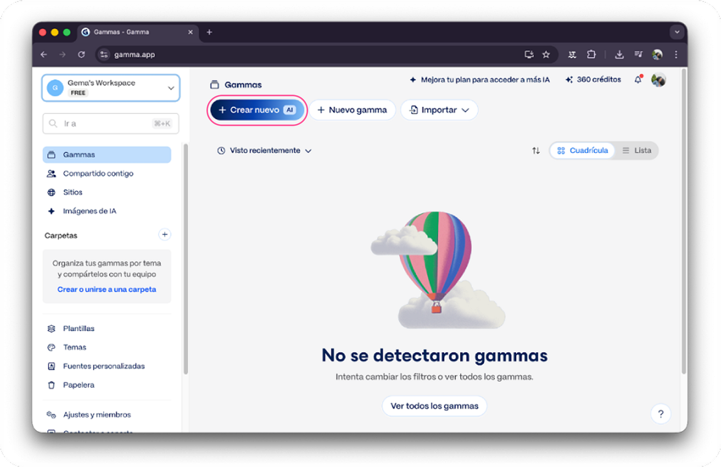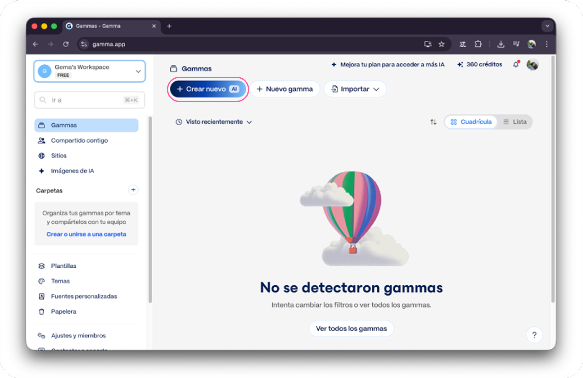 Probemos el flujo tal como lo usarías en tu día a día. El proceso arranca entrando a Gamma y eligiendo Crear nuevo AI.