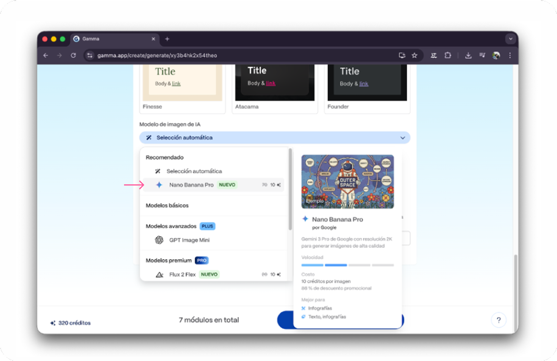 A partir de ahí, el proceso es exactamente el mismo: eliges el tema, el número de tarjetas, el estilo visual y generas el contenido con Nano Banana Pro como motor visual. Gamma se encarga de construir cada lámina con coherencia gráfica y narrativa, lista para publicarse.