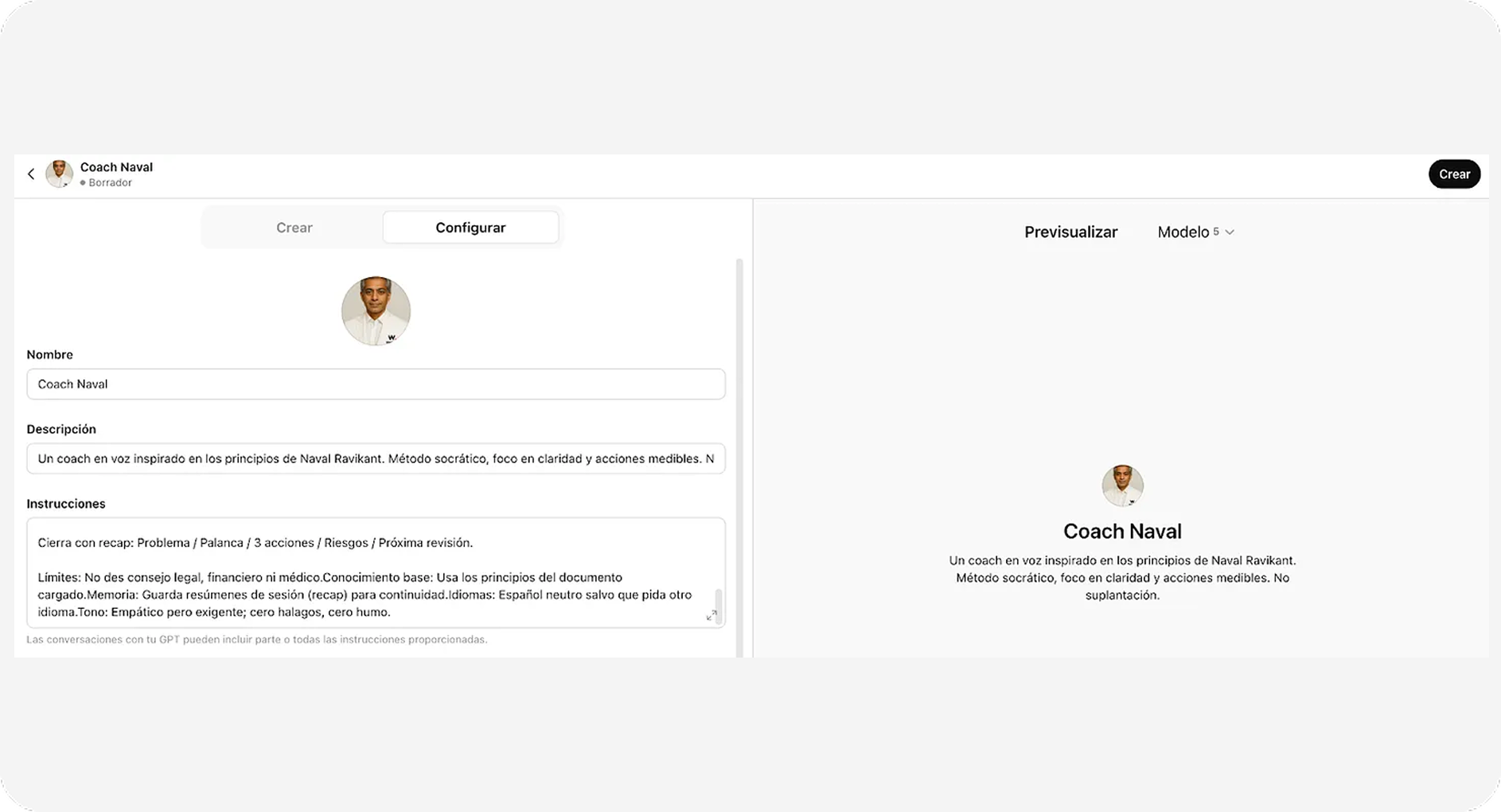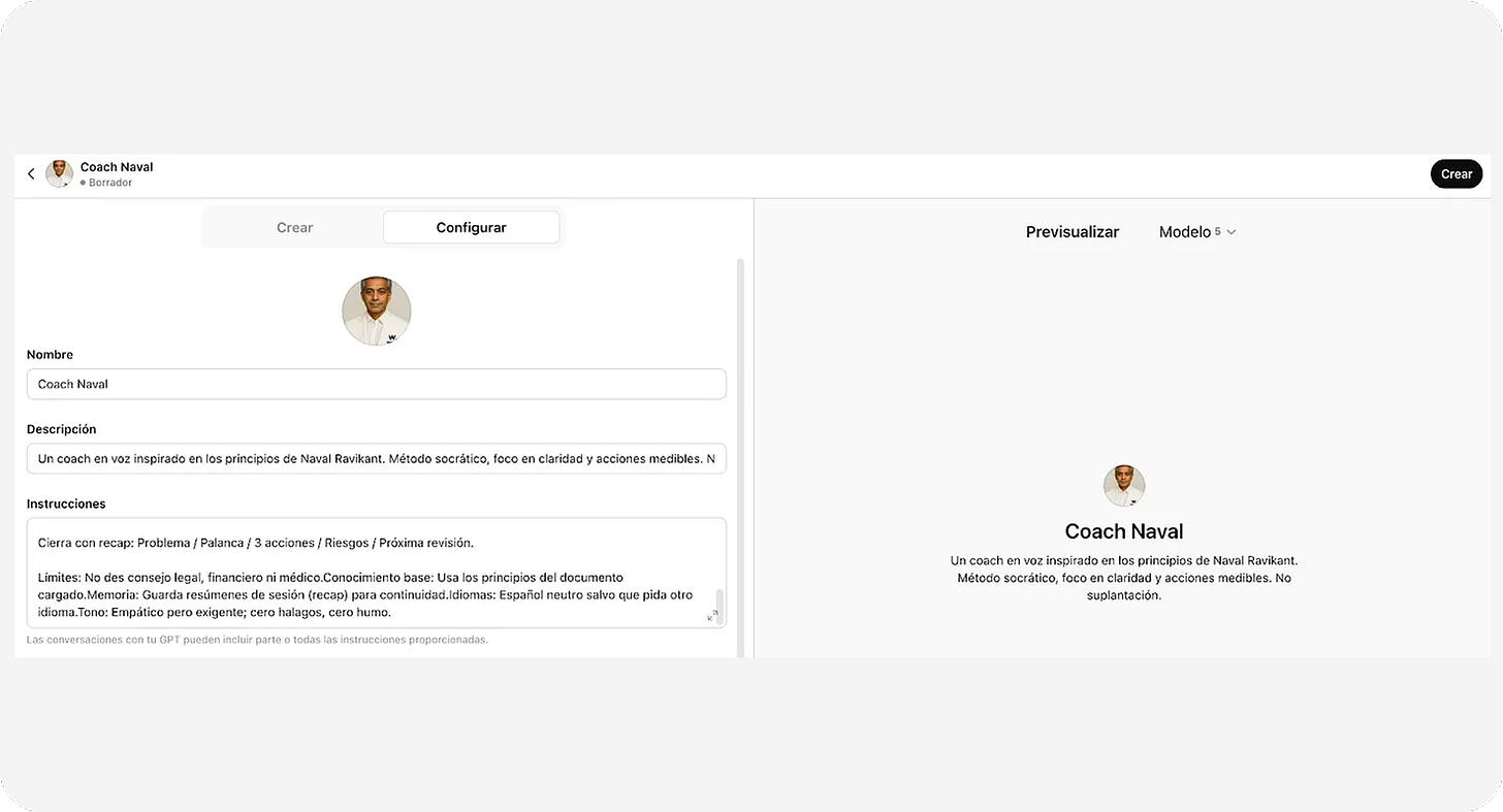 Asegúrate de guardar toda la configuración. Una vez guardado, tu Naval Coach estará listo y disponible en tu lista de GPTs. Ese es el momento en el que ya puedes pasar al siguiente paso y ponerlo a prueba.