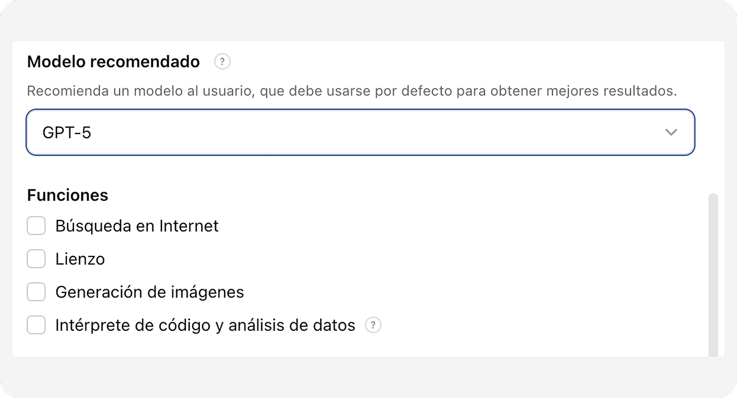 Elige GPT-5 como modelo base para garantizar mejores respuestas y capacidades.