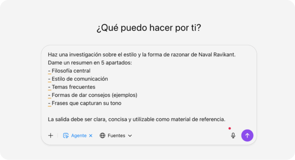 Nosotros queremos un “coach de negocio” inspirado en Naval Ravikant. La idea no es copiar frases, sino capturar su estilo: claro, directo, pragmático, filosófico cuando hace falta.