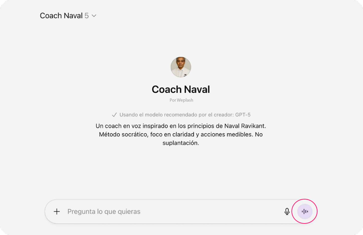 Descripción pública: “Un coach en voz inspirado en los principios de Naval Ravikant. Método socrático, foco en claridad y acciones medibles. No suplantación.”