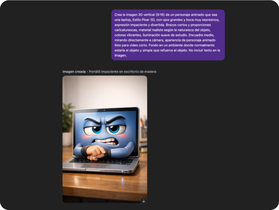 No esconde que está hecho con IA, pero se siente como una animación tipo Pixar, divertida, cercana y fácil de confiar. No juzga, no abruma, no cansa.