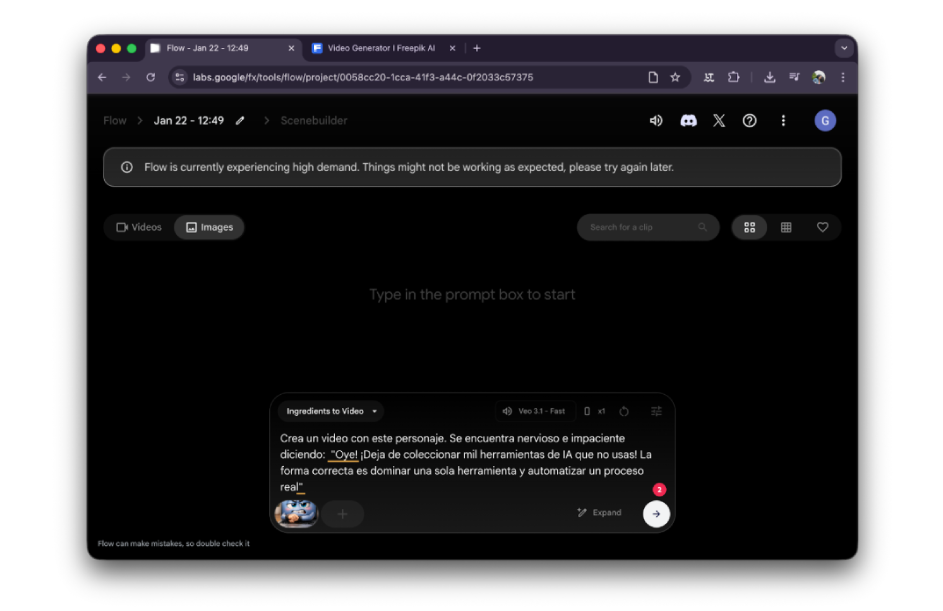 Ahora ve a Flow en Google Labs y usa Veo 3.1, o también puedes usar freepik, klingAI o cualquier plataforma de video IA que gustes.