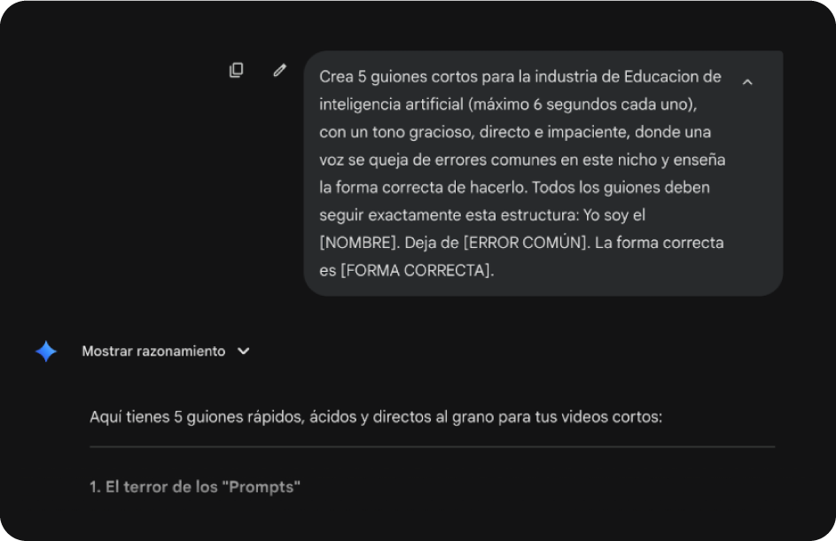 Este formato funciona mejor cuando dice poco y va directo. Puedes usar tu propio copy o generar ideas con este prompt: