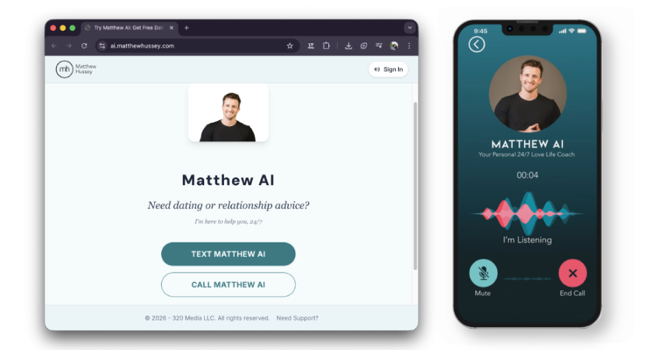 Matthew Hussey lanzó Matthew AI, un asistente por voz y texto que responde como él, con su tono, sus ideas y su manera de leer las situaciones. Está disponible todo el día, en varios idiomas, bajo suscripción mensual.