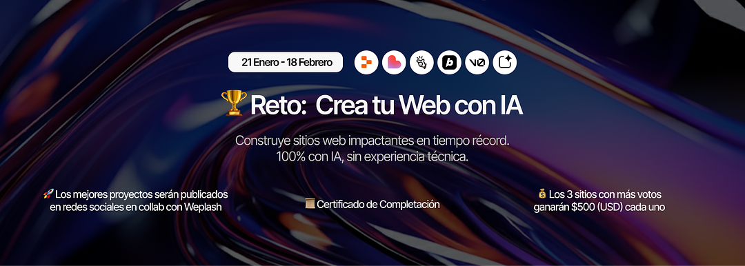 Durante el reto vas a aprender a construir sitios completos usando IA y vibe coding, con foco en estructura, claridad y resultado. Todos los participantes reciben certificado y los tres mejores proyectos se llevan $500 cada uno.