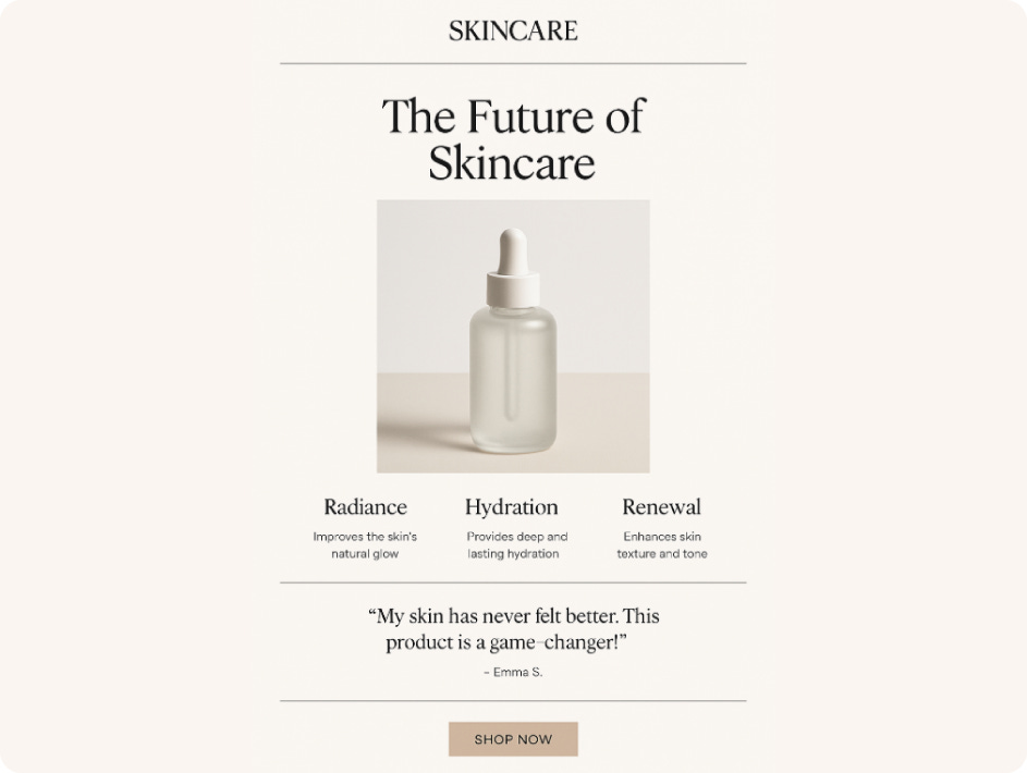 Prompt: Diseña una página de inicio para un sitio web de marca de skincare premium. Estilo visual: minimalista, fondo blanco con acentos beige y gris. Secciones: encabezado con logo centrado, hero con foto de producto, beneficios destacados en columnas, testimonios, CTA claro. Tipografía elegante. Inspirado en las webs de Glossier, Aesop y Typology.