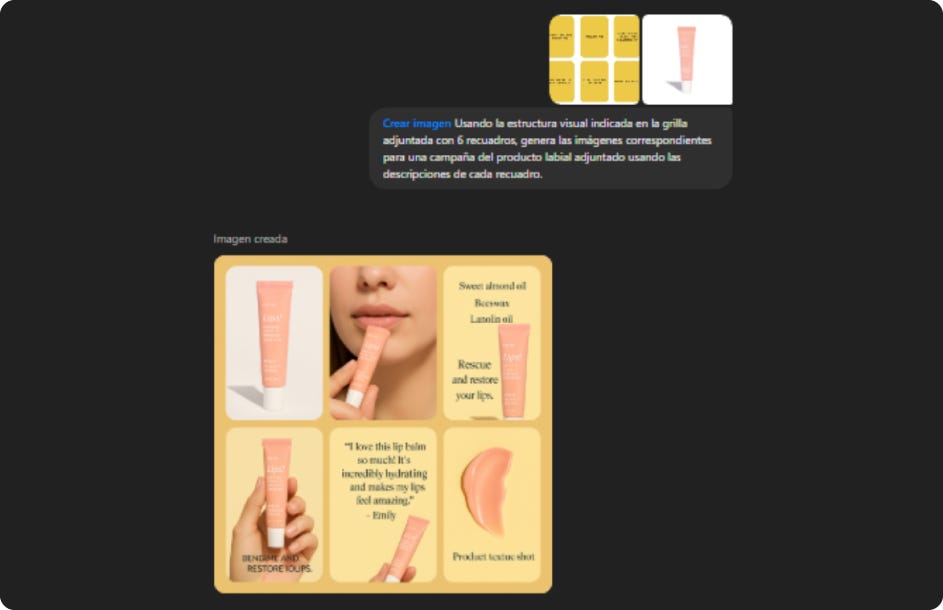 Prompt: Usando la estructura visual indicada en la grilla adjuntada con 6 recuadros, genera las imágenes correspondientes para una campaña del producto labial adjuntado usando las descripciones de cada recuadro.