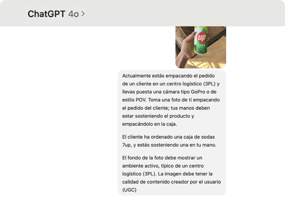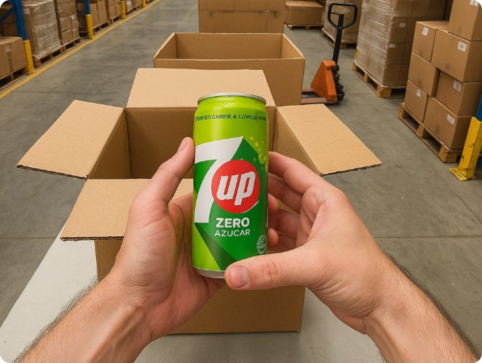 Propmt: Actualmente estás empacando el pedido de un cliente en un centro logístico (3PL) y llevas puesta una cámara tipo GoPro o de estilo POV. Toma una foto de ti empacando el pedido del cliente; tus manos deben estar sosteniendo el producto y empacándolo en la caja. El cliente ha ordenado una caja de sodas 7up, y estás sosteniendo una en tu mano.El fondo de la foto debe mostrar un ambiente activo, típico de un centro logístico (3PL). La imagen debe tener la calidad de contenido creador por el usuario (UGC).