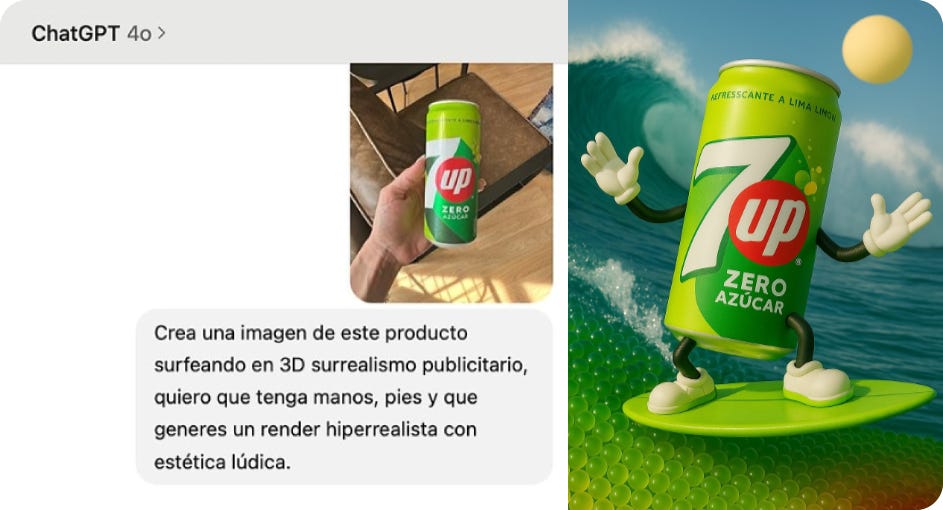 Prompt: “Crea una imagen de este producto surfeando en 3D, surrealismo publicitario. Quiero que tenga manos, pies, y que generes un render hiperrealista con estética lúdica.”