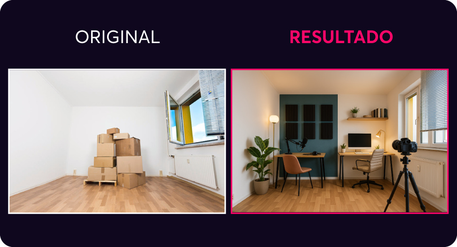 Este tipo de prompts funcionan increíble para visualizar cómo se vería un espacio físico antes de crearlo. Desde el fondo de tu podcast hasta el local de tu marca.